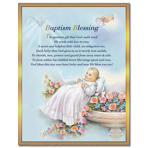 This brass picture frame measures 8 by 10 inches and includes a laminated plaque Baptism Blessing.