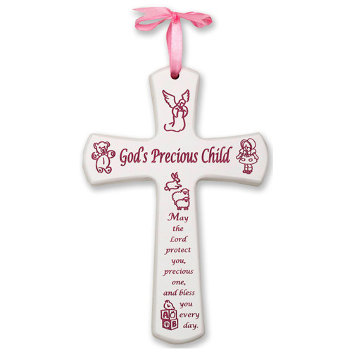 This white wooden cross is laser cut with pink painted lettering and art. Measures 6 inches tall.
