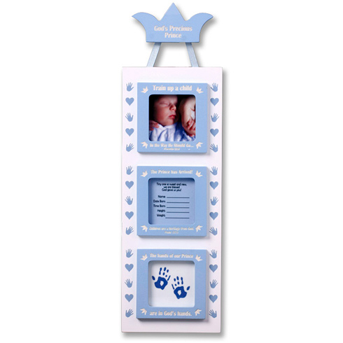 This blue three part picture frame hangs from a crown that says: God's Precious Prince. Features laser cut white painted lettering. Place a photo in the top section, fill out info in the second section, and put your own babies hand prints in the bottom section. Measures 14 by 4 inches.
