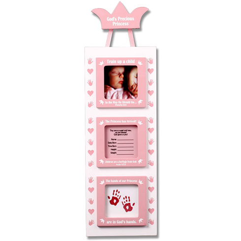 This pink three part picture frame hangs from a crown that says: God's Precious Princess Features laser cut white painted lettering. Place a photo in the top section, fill out info in the second section, and put your own babies hand prints in the bottom section. Measures 14 by 4 inches.