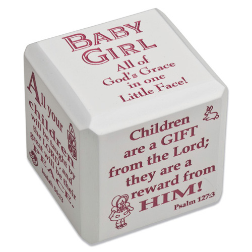 White wooden cube with laser cut pink painted lettering. Accent your child's room with beautiful, inspirational scriptures and messages. Measures 2 1/2 by 2 1/2 inches.