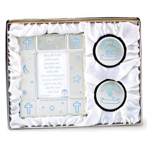 Silver metal with blue screened images and lettering. Baby picture frame measures 4 by 5 inches. Also includes My First Curl and My First Tooth keepsake boxes which measure 1 3/4 inches in diameter.