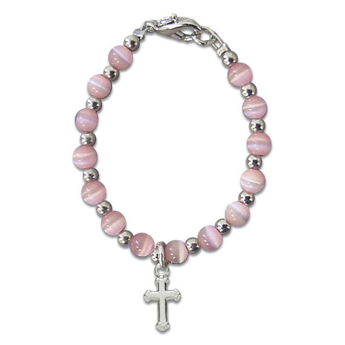 This baby's first bracelet has pink beads and silver plated beads with silver plated cross charm. Bracelet length: 4 inches. Lobster clasp. Individually carded.