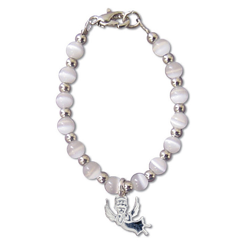 This baby's first bracelet has white beads and silver plated beads with silver plated angel charm. Individually carded.