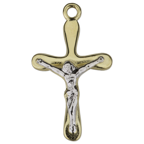 This tiny 18kt yellow gold over sterling silver 1/2 inch tall freeform crucifix comes on a light weight 16 inch gold plated chain. Deluxe gift boxed.