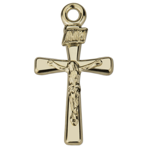 This 18kt yellow gold over sterling silver 9/16 inch tall INRI crucifix comes on a light weight 18 inch gold plated chain. Deluxe gift boxed.
