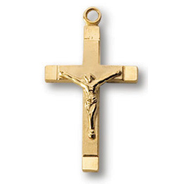 This 18kt yellow gold over sterling silver 11/16 inch tall Latin crucifix comes on a light weight 18 inch gold plated chain. Deluxe gift boxed.