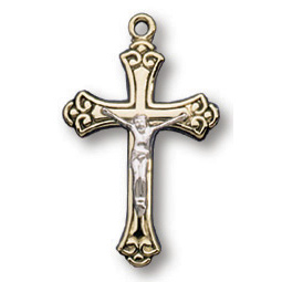 This 18kt yellow gold over sterling silver 11/16 inch tall budded crucifix comes on a light weight 18 inch sterling silver chain. Deluxe gift boxed.