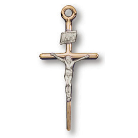 This 18kt yellow gold over sterling silver 3/4 inch tall skinny INRI crucifix comes on a light weight 18 inch gold plated chain. Deluxe gift boxed.
