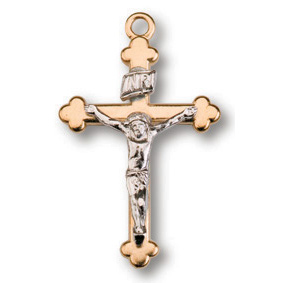 This 18kt yellow gold over sterling silver 3/4 inch tall budded crucifix comes on a light weight 18 inch gold plated chain. Deluxe gift boxed.