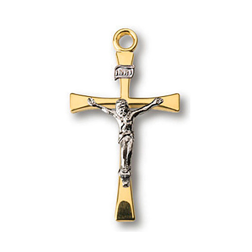 This 18kt yellow gold over sterling silver 13/16 inch tall crusader crucifix comes on a light weight 18 inch gold plated chain. Deluxe gift boxed.