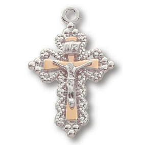 This sterling silver 3/4 inch tall beaded crucifix comes on a light weight 18 inch sterling silver chain. Deluxe gift boxed.