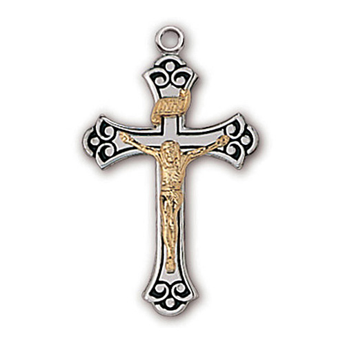 This sterling silver 1 inch tall fleur de lis crucifix comes on a light weight 18 inch sterling silver chain. Deluxe gift boxed.