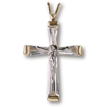 This 18kt yellow gold over sterling silver 7/8 inch tall cubic zirconia crucifix comes on a light weight 18 inch gold plated chain. Deluxe gift boxed.