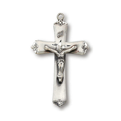 This sterling silver 1 inch INRI crucifix has fleur-de-lis tips.Lightweight 18 inch sterling silver chain. Deluxe gift boxed.