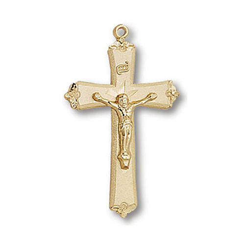 This 18k yellow gold plated sterling silver fleur de lis tipped crucifix comes on a light weight 18 inch gold plated chain. Pendant length: 1 inch. Deluxe gift boxed.