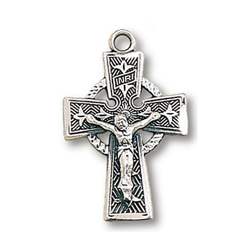 This sterling silver 3/4 inch tall Celtic crucifix comes on a light weight 18 inch sterling silver chain. Deluxe gift boxed. Import.