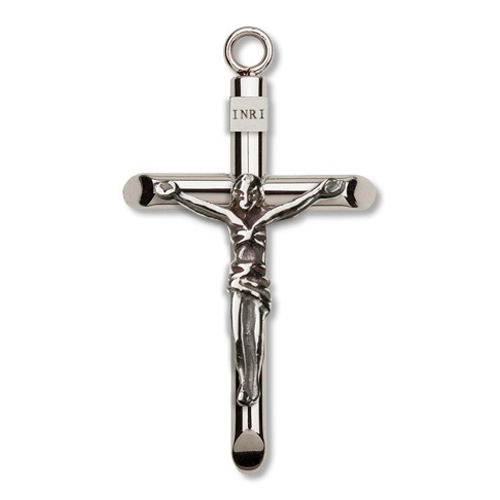 This large stainless steel 1 1/4 inch tall cylinder crucifix comes on a 24 inch stainless steel ball chain. Made of the finest quality 316L stainless steel. Will not rust or tarnish and is naturallly hypoallergenic. Deluxe gift boxed.