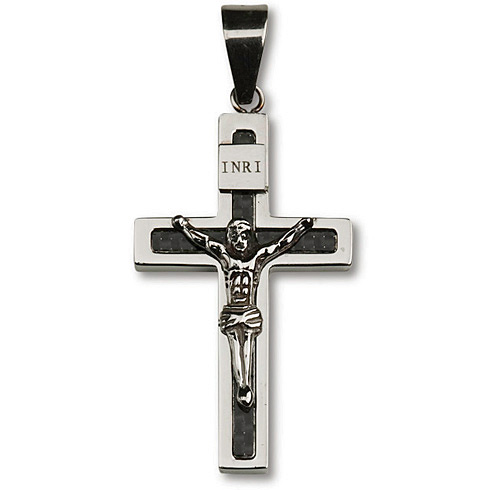 This stainless steel 1 1/2 inch tall carbon fiber inlay crucifix on stainless frame comes on a 24 inch stainless steel ball chain. INRI is engraved above Christ. Made of the finest quality 316L stainless steel. Will not rust or tarnish and is naturallly hypoallergenic. Deluxe gift boxed.