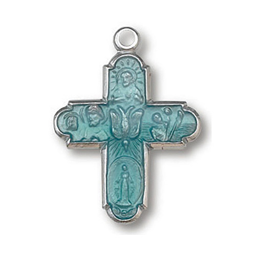 This sterling silver 3/4 inch tall blue enameled four way cross pendant comes on a 18 inch light weight silver chain. Deluxe gift boxed. The back of the pendant has the inscription: I AM A CATHOLIC PLEASE CALL A PRIEST. It also has a very small M, heart and 12 stars.