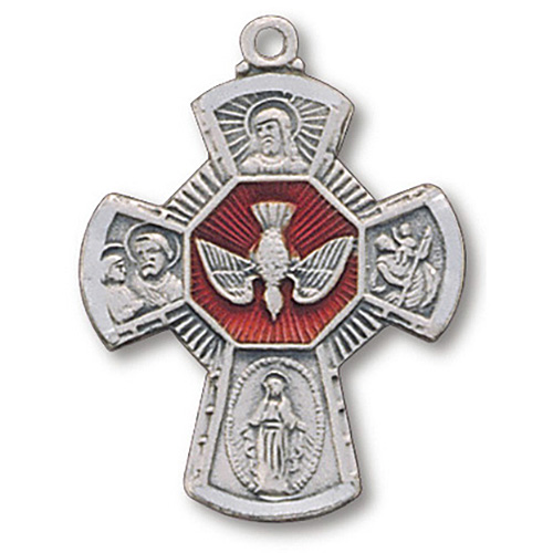 This sterling silver 1 1/8 inch tall red enameled four way cross with dove center comes on a 24 inch heavy weight stainless steel chain. Deluxe gift boxed.