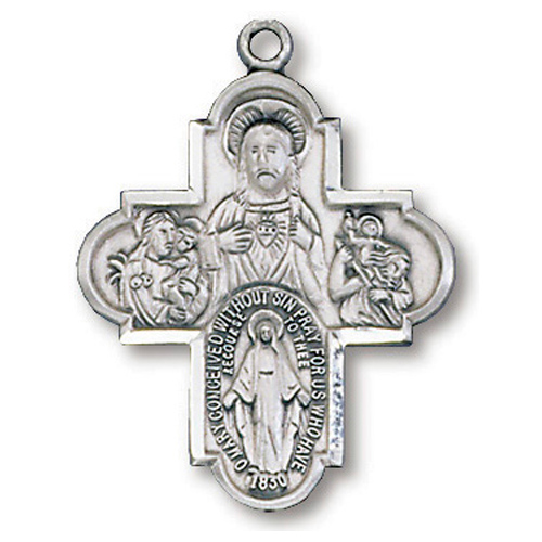 This sterling silver 1 inch tall four way medal comes on a 18 inch medium weight stainless steel chain. Deluxe gift boxed.