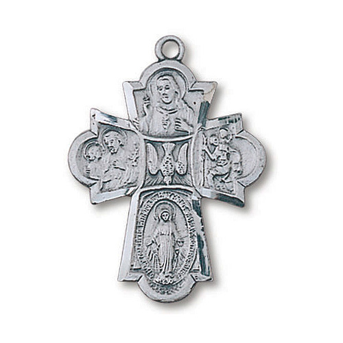 This sterling silver 1 3/16 inch tall four way cross comes on a 24 inch heavy weight stainless steel chain. Deluxe gift boxed.