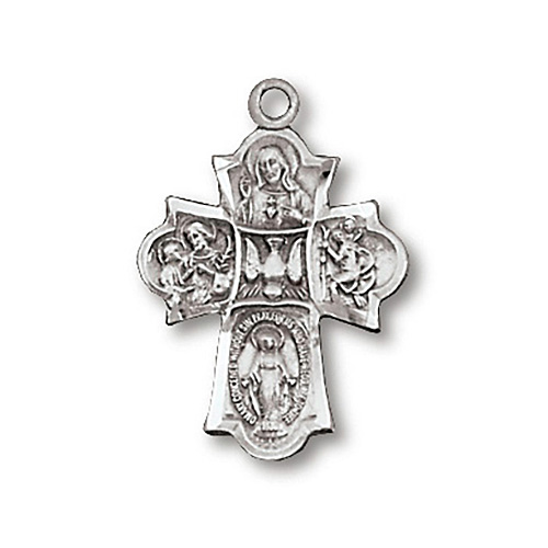 This sterling silver 7/8 inch tall four way cross comes on a 18 inch light weight sterling silver chain. Deluxe gift boxed.