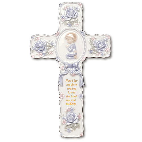 This ceramic 9 inch wall cross has a praying boy in the center and the prayer Now I lay me down to sleep I pray my Lord my soul to Keep.