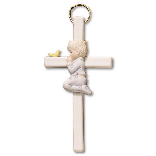 This bisque porcelain 7 1/2 inch wall cross has a praying boy in the center and a bird. Comes with a metal loop for hanging.