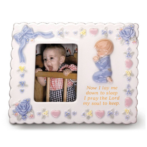 This ceramic 4 inch by 6 inch praying boy picture frame reads Now I lay me down to sleep I pray the Lord my soul to keep.