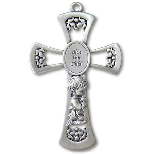 This pewter 5 1/2inch wall cross has the inscription Bless This Child. Praying boy is kneeling. This wall cross is perfect for his room.