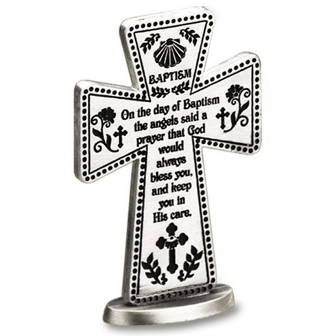 This genuine pewter 3 inch standing cross reads BAPTISM On the day of Baptism the angels said a prayer that God would always bless you, and keep you in His care.