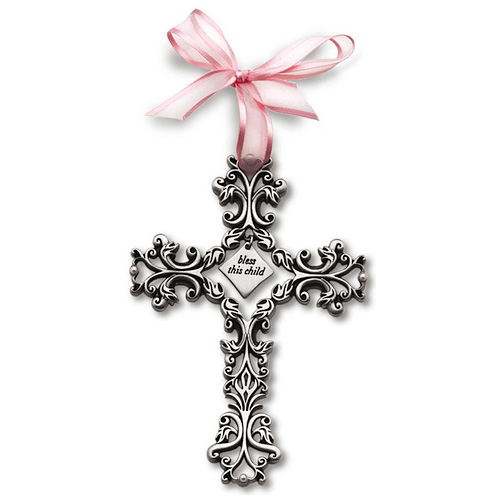 This 5 inch tall genuine pewter girls' filigree wall cross has bless this child engraved in the center and comes with a pink ribbon.