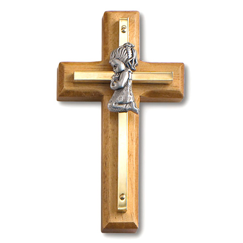 This 4 1/2 inch tall beveled wood wall cross has a praying girl in the center and a gold plated over brass cross.