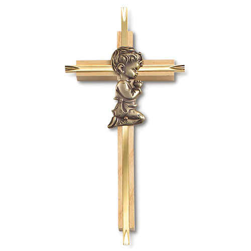 This 7 inch tall wood wall cross has a praying boy in the center and a gold plated over brass inlay cross.