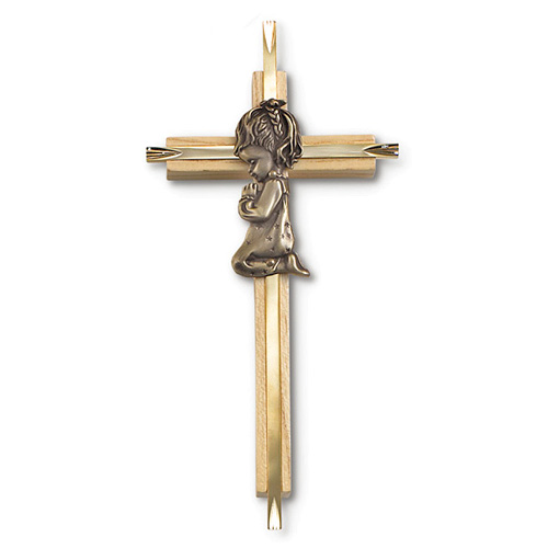 This 7 inch tall wood wall cross has a praying girl in the center and a gold plated over brass inlay cross.