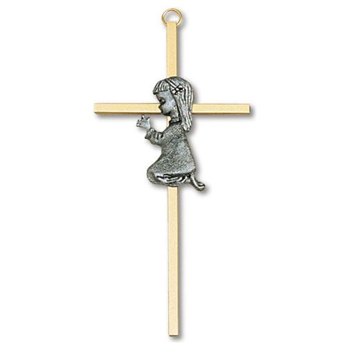 This 7 inch tall wall cross has a praying girl in the center and is made of gold plated over brass.