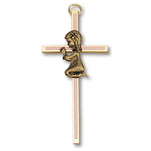 This 4 inch tall wall cross has a praying gilr in the center and is made of gold plated over brass with a pink silk screened center.