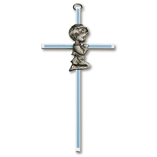 This 6 inch tall wall cross has a praying boy in the center and is made of gold plated over brass with a blue silk screened center.