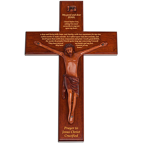 This 12 inch tall beveled wall Crucifix is made of solid mahogany with a resin corpora. It includes laser cut gold painted lettering of the Prayer to Jesus Christ Crucified.