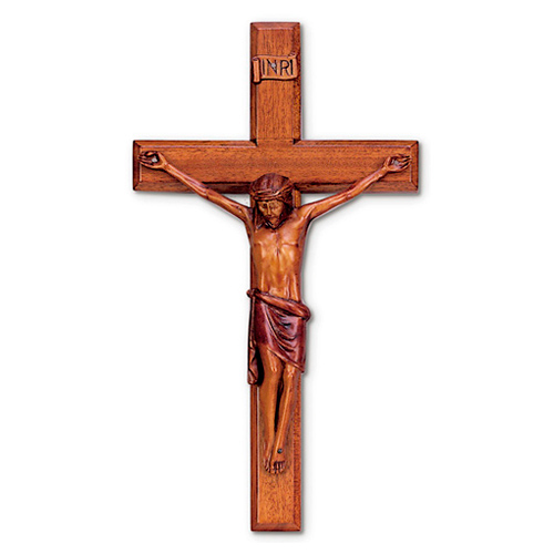 This 16 inch tall beveled INRI wall crucifix is made of solid mahogany with a resin corpora.