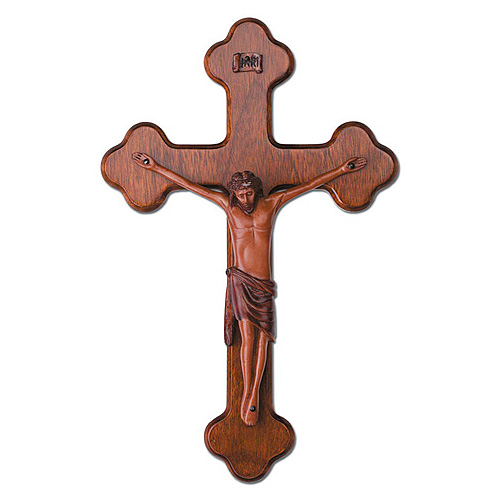 This 12 inch tall wall Crucifix is made of solid mahogany. Budded style cross with beveled edges.