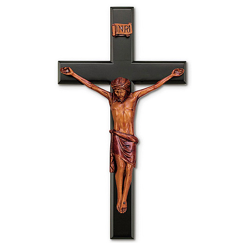 This 16 inch tall wall Crucifix is made of solid mahogany that has been stained matte black. It has beveled edges and a resin corpora.