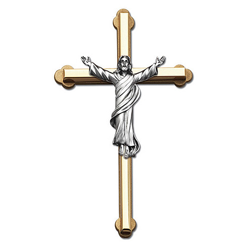 This 8 inch tall satin metal Risen Christ cross has a bright gold overlay and pewter finished corpus.
