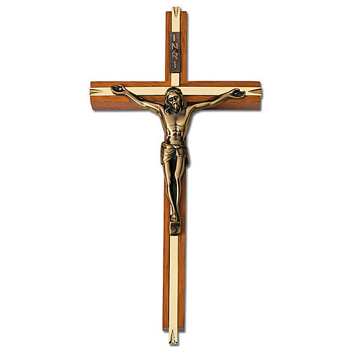 This 8 inch tall stained walnut wood wall crucifix has a gold plated solid brass cross inlay and features a gold corpus.