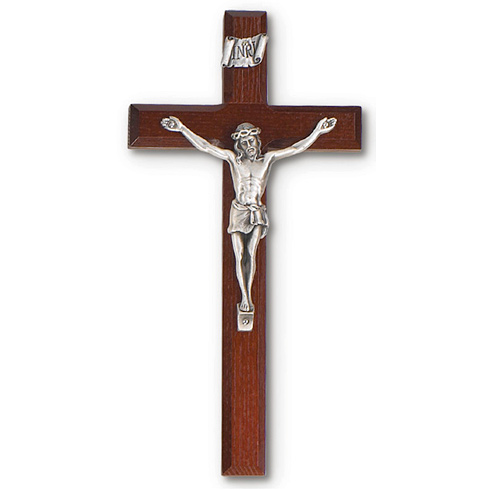 This 8 inch tall cherry stained beveled wood wall crucifix has a silver corpus.
