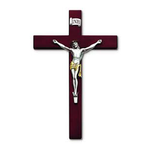 This 6 1/2 inch tall piano finished wood wall crucifix has a pewter finished corpus with gold accents.