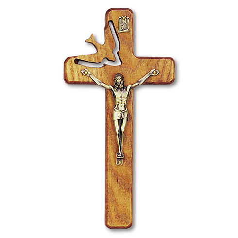 This 8 inch tall walnut stained wood wall crucifix has a cut-out dove and gold corpus.