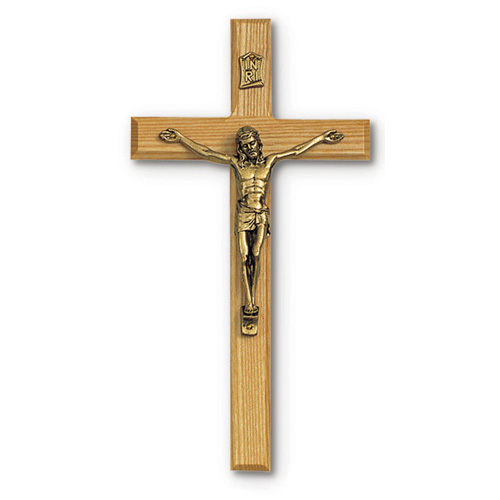 This 8 inch tall beveled oak wood wall crucifix has a gold corpus.
